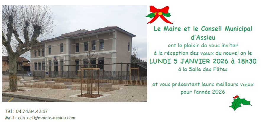 Le Maire et le Conseil Municipal d’Assieu ont le plaisir de vous inviter à la réception des voeux du nouvel an le LUNDI 5 JANVIER 2026 à 18h30 à la Salle des Fêtes
